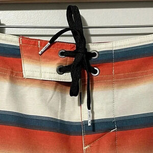 New condition. Small pin prick mark from sale tags near waistband (see photo). Tan / orange / gray stripes. Side zipper closure pocket. Lace up & velcro fly. Outseam 21” Inseam 10.5” Rise 11.5”