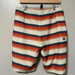 New condition. Small pin prick mark from sale tags near waistband (see photo). Tan / orange / gray stripes. Side zipper closure pocket. Lace up & velcro fly. Outseam 21” Inseam 10.5” Rise 11.5”