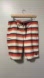 New condition. Small pin prick mark from sale tags near waistband (see photo). Tan / orange / gray stripes. Side zipper closure pocket. Lace up & velcro fly. Outseam 21” Inseam 10.5” Rise 11.5”