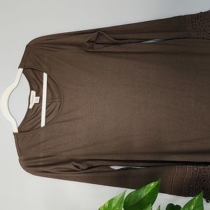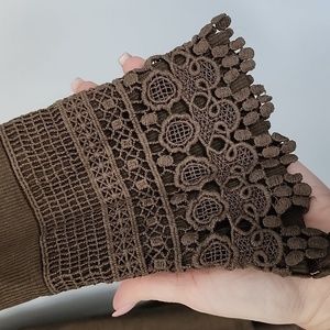 This shirt is in very good used condition, scoop neckline, crochet at cuffs, slits on the sides at the waist