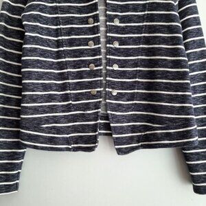 • Long sleeve unlined, open front blazer jacket in blue with white stripe pattern and two front uniform style metal button detail.