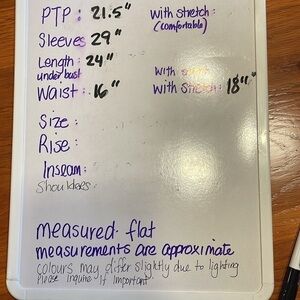 Measures are approximate and are done flat. Best fit is from using measures not manufacturer’s sizing as fit varies and clothes may have shrunk or have been altered.