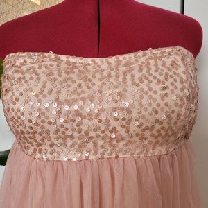 The ultimate girly party dress! Lined, strapless. Pink with pink sequins on the bodice and two layers of tulle for a flouncy full skirt. Size medium with a side hidden zipper and slightly stretchy bodice and waist.