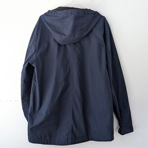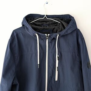 Stylish dark blue windbreaker with a hood. Features a front zipper, chest pocket, side pockets and crisp white accents. Lightweight, 100% cotton body, ideal for everyday wear.