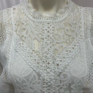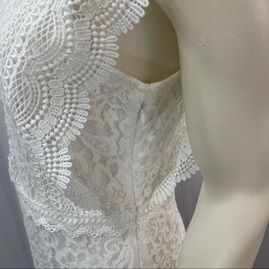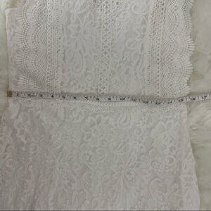 This gorgeous lace dress by ONLY is lined up past the bustline, and the opens up in a nice "V" shape to show skin through the lace, up t o the neckline. There is a hidden zipper in the side.
