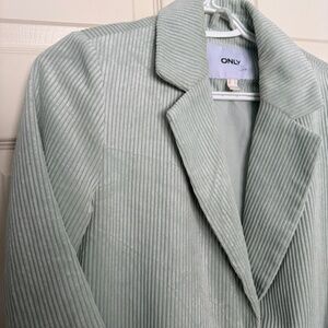 SUPER CUTE Courduroy Jacket for Spring. Has a couple tiny stains on the back and one on the edge, very minuscule and hard to notice, but I did want to mention them! Other than that it is in perfect condition, perfect coat for those in between seasons!