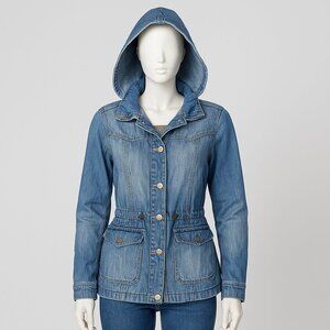 only denim jacket, women’s hooded denim coat, medium wash jean jacket, utility style jacket, denim outerwear, women’s medium jacket, casual streetwear denim, drawstring waist denim jacket, everyday denim layering piece