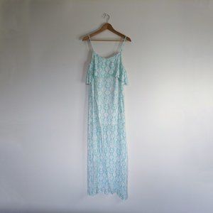 Beautiful O’Neill maxi dress, with an aqua blue and white pattern. Ruffled top. Size small.