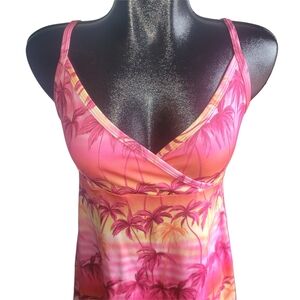 Vibrant tropical dress with palm tree design. Features pink, orange and yellow hues. Fabric and size tags are missing.