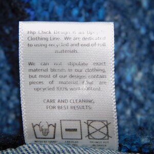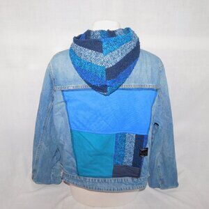 This gorgeous One Of A Kind OOAK Womens XL Hip Chick Design Upcycled eco friendly Blue Patchwork Denim Jean Jacket is in great clean bright condition. Jacket is 100% . Hood is and some of the patching is from a Baja Hoodie. Other eco friendly materials used. There is no specific size tag as it's an upcycled item - but measures XL - see measurements below.