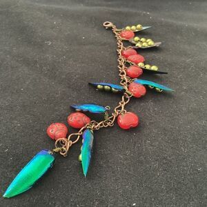 Jewel beetle wings with “peas in a pod”, glass lady bugs and tomato beads, copper tone chain, 7.5” long drop. 15” total