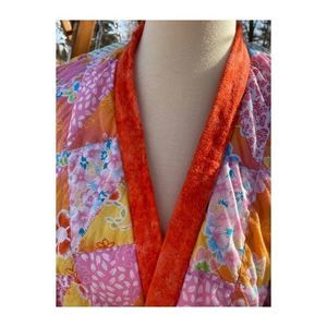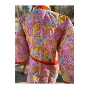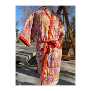Vintage and likely handmade with extreme care and love. One of a kind. No tags. Beautiful psychedelic mix print quilted housecoat with waist Sash. Wide 3/4 length sleeves. Two front pockets. Fully lined and feels to have “stuffing” in the quilting for warmth. No rips, tears or stains noted. Pet and smoke free home.