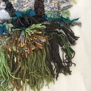 Designed and woven by Miz Mary Design. Blue green tones. Cotton/wool/silk/miscellaneous and novelty yarns. Fringe for loops (dowel not provided). NWT. 16”20” wide, 25” long with fringe, 14” long without fringe