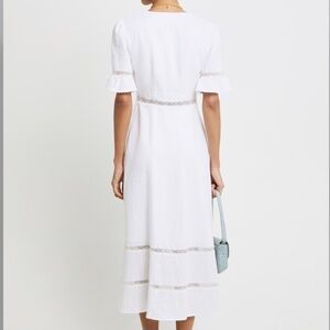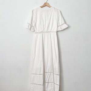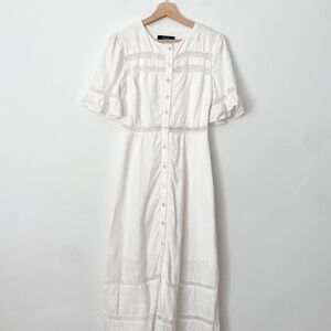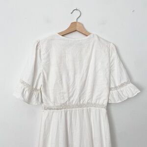 The Adina Dress exudes elegance and charm with its delicate sheer lace panels and ruffle detailed sleeves. The button up design allows for an adjustable neckline and a classic look.