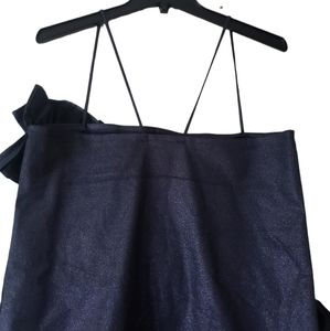 Spaghetti sleeve shimmer indigo mini dress with ruffled front. Great preowned condition in large. measurements laying flat; pit to pit 18" waist 19" hip 20"