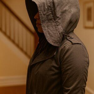 The hood provides great coverage, and the jacket’s tailored fit flatters the body while still allowing room for layering. Perfect for casual outings, fall weather, or running errands in comfort and style. Both sleeve cuffs have visible wear on the inner knit layer, including fraying, loose threads, and small pulled fibers. These flaws do not affect the functionality of the jacket but should be noted for full transparency. Please refer to the photos for details.