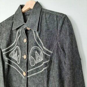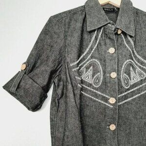 ORLY Denim 3/4 Utility Sleeve Jean Embroidery Button Down Shacket Sz 6
