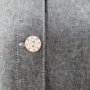 • Button up black denim with white embroidered floral cottagecore pattern. Button closure light jacket / blazer top with side slits. Each button has flower pattern carved into it. Sleeves roll-up for a more casual look. Wear it as a button up shirt or as a light jacket/ cardigan. Versatile black denim top that due to the fabric weave looks dark grey.