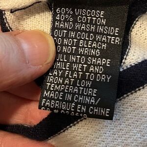 Haut en maille sans manches à rayures noir et blanc, avec une petite poche à l’avant et un ourlet asymétrique qui apporte une touche d’originalité. Encolure en V et coupe fluide pour un style décontracté et confortable. En excellent état.