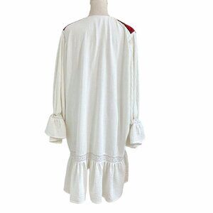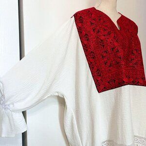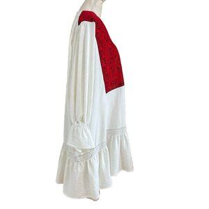 ORO WHITE GAUZY RED EMBROIDERY BIB MIDI KAFTAN DRESS this is a kaftan inspire knee length gauzy dress in a contrat white and red colours - red magnificent detailed embroidered bib around a v-neckline - half sleeves with elastic at cuffs and a bell flutter sleeve style - embroidered stripe on the 3/4 of the dress for a cute boho / bohemian / paysant detail - unlined- stretch - super flowy and comfy- heavy super high quality fabric - no tag designer high end piece. Perfect for ritual sacred costum or a summer favorite casual to trip / vacation vibe dress with sandals or flats - heels or grec strappy sandals. Original - one of a kind - rare. Excellent like new condition.