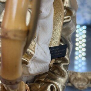 Bag body leather gathering construction with real bamboo top handle. Bamboo handle is removable and detachable. Bag can be worn three ways: clutch with all straps removed, with bamboo top handle only or with crossbody strap only.