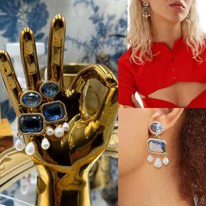 🆕 OSCAR DE LA RENTA 🧿 NWOT Chandelier Earrings with Pearly Drop, Blue Crystal
