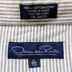 Hailing from the designer brand Oscar de la Renta, this very well-made shirt is light to light-medium weight, very subtly stretchy, and comprised of 100% cotton.