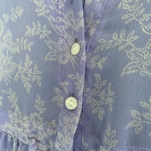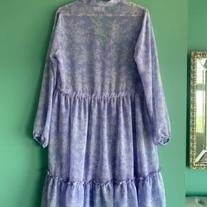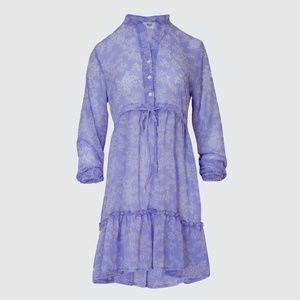 Lavender flower printed button-up midi smock dress with gathered tiers and front tie detail. The Nikoline’s light material adds versatility; making it perfect for throwing over a swimsuit or layering under a cute vest. Sustainably produced in London using surplus fabrics. The dress is sheer and needs a slip underneath.