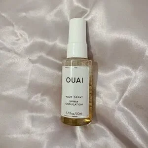 Textured wave hair spray from OUAI. Light amber formula visible in a clear bottle. Spritz application for effortless beachy waves.