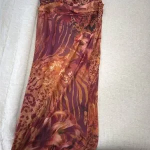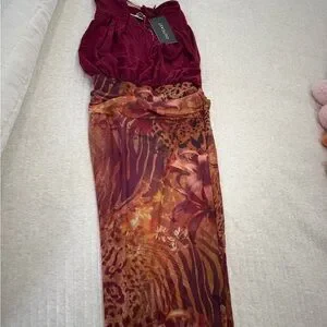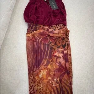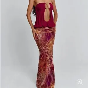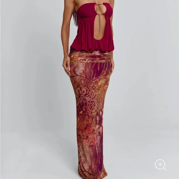 Designed with a printed mesh skirt and a contrasting deep berry bodice, she features a daring centre cut-out and gold hardware detail at the bust. The billowy top flows effortlessly into a ruched waistband and figure-hugging maxi skirt, creating the perfect balance of movement and structure.