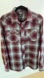 Outdoor Research flannel shirt, Feedback style. Red, white and blue plaid also has a herringbone design in the fabric. Button front, two front pockets. 100% polyester, soft brushed flannel shirt. Wicks moisture.