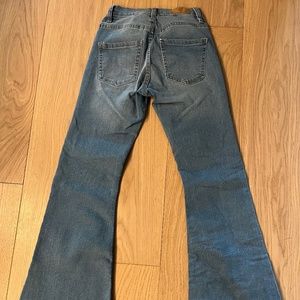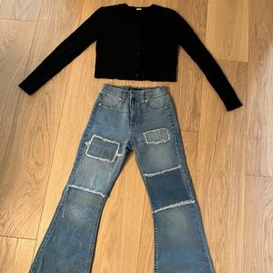 OUTFIT - Bluenotes Super High Rise Flare jeans with patchwork detail in front. Size 0. Twik Simons long sleeve Botton front ribbed top. Size SM