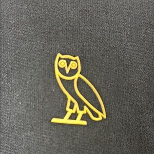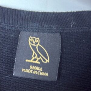 This OVO crewneck sweater in black features a subtle gold emblem on the chest, offering a touch of elegance. Made from a thick, comfortable material, it's perfect for cooler weather. The ribbed cuffs and waistband add to its timeless appeal.