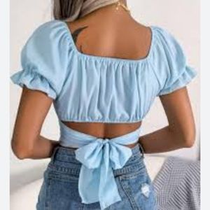 NWT Sky Blue Puff Sleeve Princess crop frill tie around Top in cotton blend fabrics.