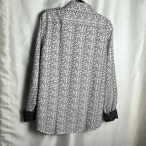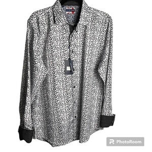 White with black , red and pink abstract dots . Classy two tone . Contrasting cuffs and inside collar plus where you button up .very very nice cool