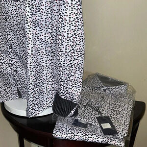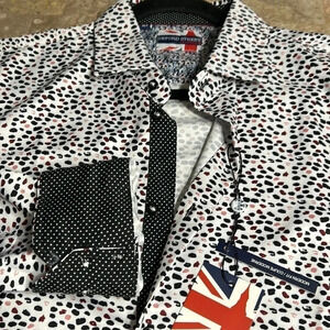 White with black , red and pink abstract dots . Classy two tone . Contrasting cuffs and inside collar plus where you button up .very very nice cool