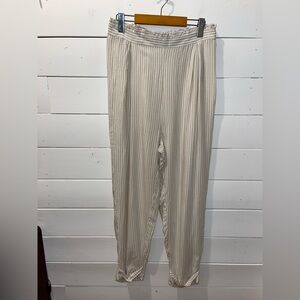 Elegant beige and white striped pants with a relaxed fit and soft, flowing fabric. The pleated front adds structure while the elastic back waistband ensures comfort. A perfect piece for minimalist, breezy outfits.
