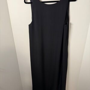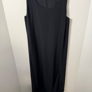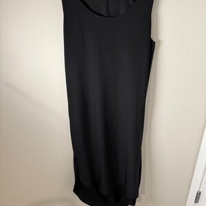 Minimalist and effortlessly modern, this Oak + Fort black midi dress features a draped silhouette with clean lines and a high-low hem. Made from 100% polyester, it offers a lightweight, flowy fit with a soft sheen. The dress is lined so it sits nicely.