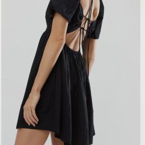 Puff sleeve mini dress with an A-line skirt and an open back with two ties.