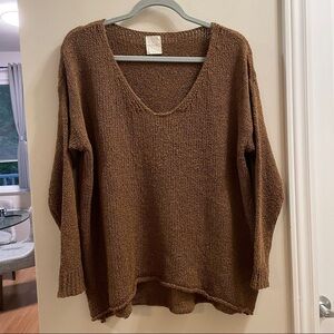 This oversized golden brown sweater by Loft 82 is perfect for fall and winter. Made in Korea, it features a soft popcorn-textured knit crafted from a 50% wool and 50% acrylic blend. The V-neck and loose fit provide a cozy yet stylish look, making it a versatile wardrobe staple.