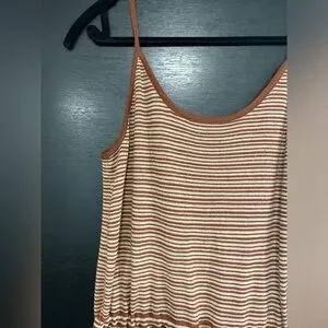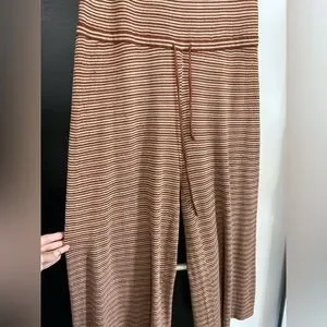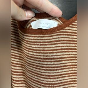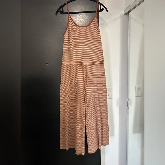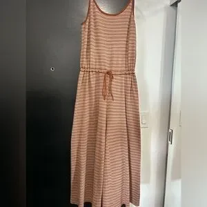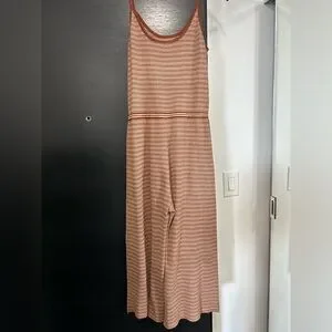 Cozy romper by Oak + Fort. Perfect for the cottage or vacation. Burnt orange and beige, cropped style, above the ankle. Tie detailing to cinch the waist. Would fit size small or medium