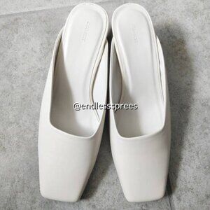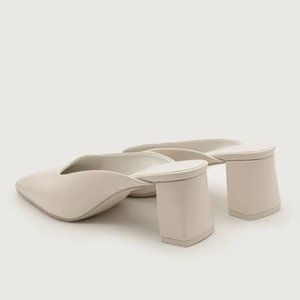 Oak + Fort Square Toe Mule Heels in off white or oatmeal. Perfect for the new season - these slip on heeled mules are designed with a sleek square toe that looks good with any outfit. A comfortable pair that you can wear from day to night. Square toe, vegan leather, Slip on. FO-6538-W-Oatmeal-6
