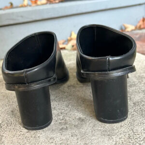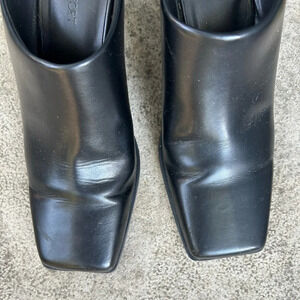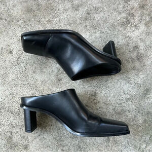 Slip on and go with these great square toe mules. In contrast the heel is round.