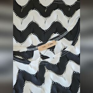 black and white , short sleeve, guc, crew neck, see through sections , size small, wavy chevron like design