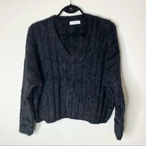 Oak and Fort Fuzzy Sweater V-neck Brushed Knit Black pullover fluffy Size XS