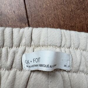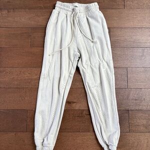 Jogger style sweatpants with adjustable drawstrings and terry fleece lining and size XS.