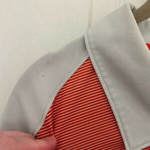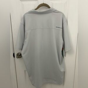 Light and breezy grey gold shirt with darker grey and orangey/red design on front. Couple of very small marks on right shoulder (see pics), otherwise excellent condition. 100% polyester and comes with extra button. Made in Thailand. 24.5” pit to pit. Bundle with other golf shirts for great deal.