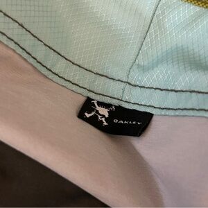 Stylish Oakley board shorts with a vibrant green and yellow gradient. Features a secure pocket and adjustable drawstring.