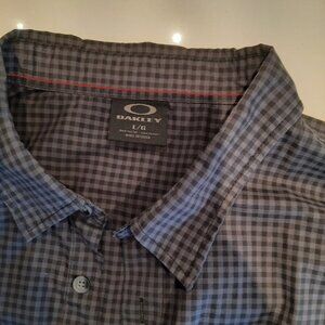 Really nice Oakley button down shirt in Large. Great checker/basket weave pattern with black and gray contrast. Shirt is in great condition. No notable flaws.
