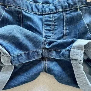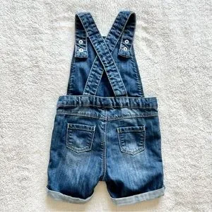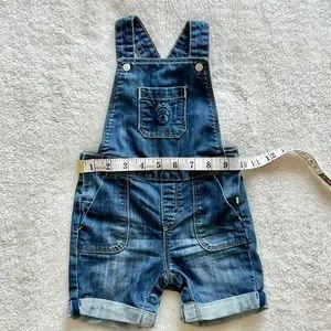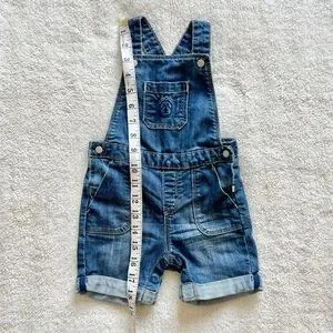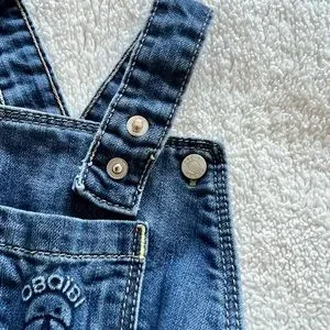 Short overalls for baby boys. Supple blue denim overalls. Lined top. Adjustable and snap-fastened straps which are crossed at the back. Snap-fastened sides and crotch. Patch pocket in front with an embossed motif. 2 patch pockets in front + 2 pockets in back. Sewn turn-ups on the leg bottoms. Small Obaïbi label.